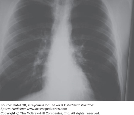 Direct trauma to the anterior chest can lead to the accumulation of fluid in the pericardial sac or pericardial tamponade. As fluid accumulates, the cardiac function is compromised. The ventricles cannot fill, cardiac output decreases, and cardiogenic shock results. The classic findings on examination are jugular vein distention, hypotension, and muffled heart sounds. The ECG may show sinus tachycardia with electrical alternans and PR segment depression.4 Immediate decompression under ultrasound guidance is the treatment. Full recovery is expected with early intervention and the athlete can return to sports following recovery.